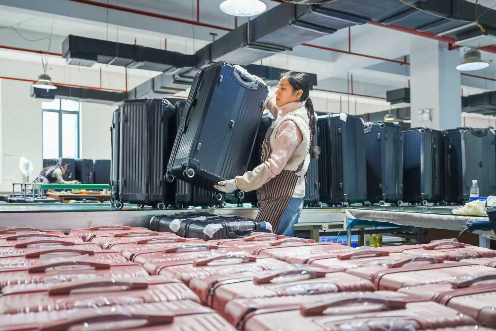 12月27日,蓝山县皮具箱包科技产业园勤工箱包有限公司生产车间,工人在赶制一批箱包订单。(通讯员 彭华 摄)