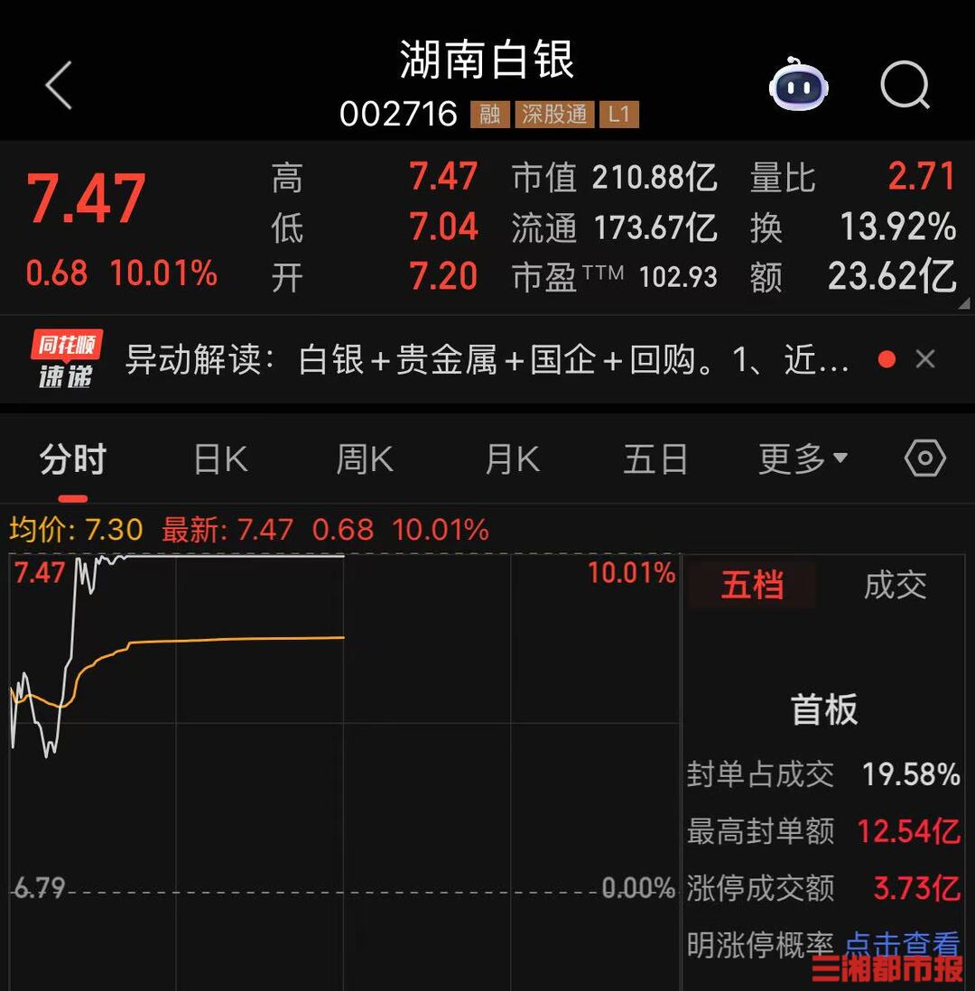 值得注意的是,A股贵金属板块盘中震荡走强,湖南白银在上午10时12分10%涨停,恒邦股份、兴业银锡、盛达资源等股跟涨。截至收盘,湖南黄金上涨1.3%。