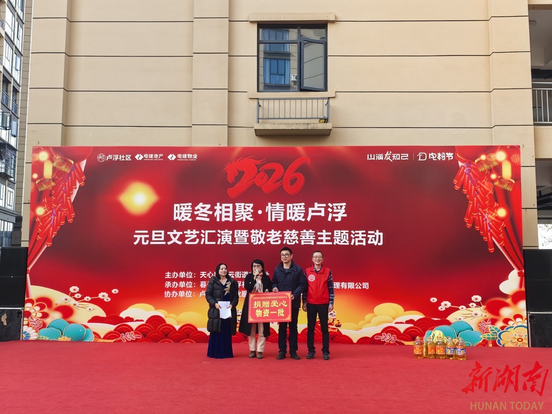 冬日暖阳,情系桑榆。为营造欢乐祥和的社区氛围,增强居民归属感与凝聚力,进一步关爱老年群体,普及禁毒、防诈骗等安全知识,12月27日下午,长沙市天心区暮云街道卢浮社区联合长沙中电建江河物业管理有限公司,在卢浮原著小区64栋物业服务中心前坪温情举办“暖冬相聚·情暖卢浮”元旦文艺汇演暨敬老慈善主题活动。辖区文艺骨干、新一届居民代表、党员志愿者及居民群众100余人欢聚一堂,共同享受了一场融文艺表演、安全科普与慈善关爱于一体的社区文化盛宴。