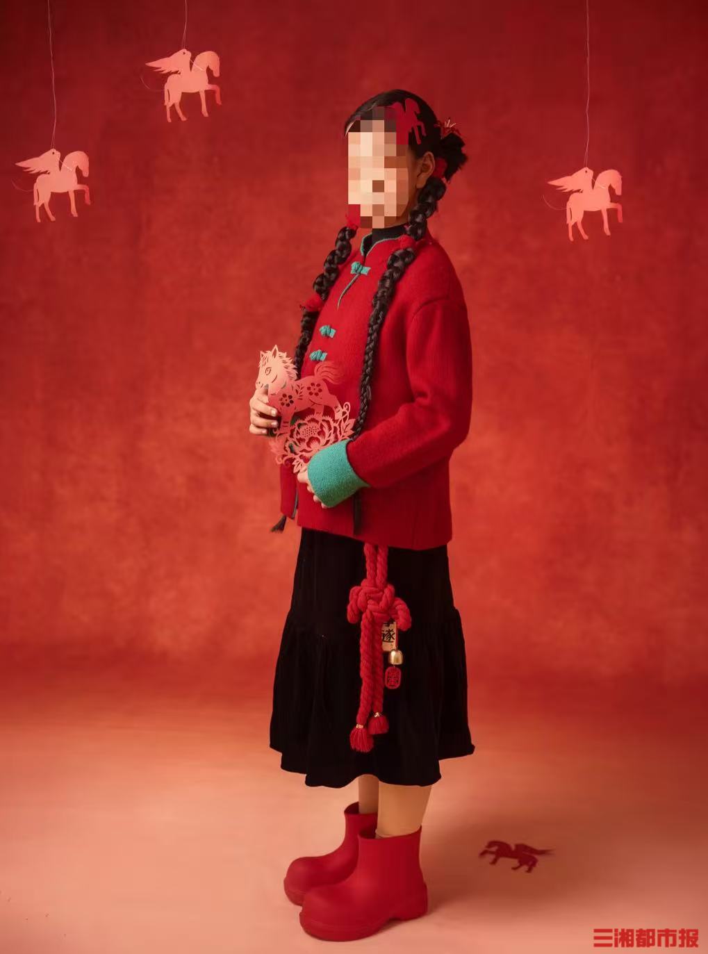长沙的拾野映画也上新了多套新年写真。其中一组样照里,小女孩梳着麻花辫、系着红头绳的孩童手持剪纸小马,周身环绕马形剪纸装饰。另一套马年写真中,小朋友手拿马年皮影,身着有马纹图案的新中式马甲。