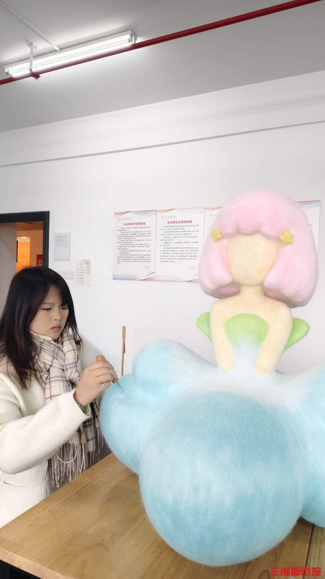 12月29日,在湖南工艺美术职业学院(长沙基地)内,大三学生张慧芬的羊毛毡花仙子作品吸引了来往行人的注意。这位痴迷动漫的女孩,以手工制作专业技术为依托,耗时近1000小时,经百万次针戳,用五彩羊毛毡塑造出栩栩如生的花仙子模型,将童年对动漫的热爱与对植物的欢喜,定格成可触摸的美好。