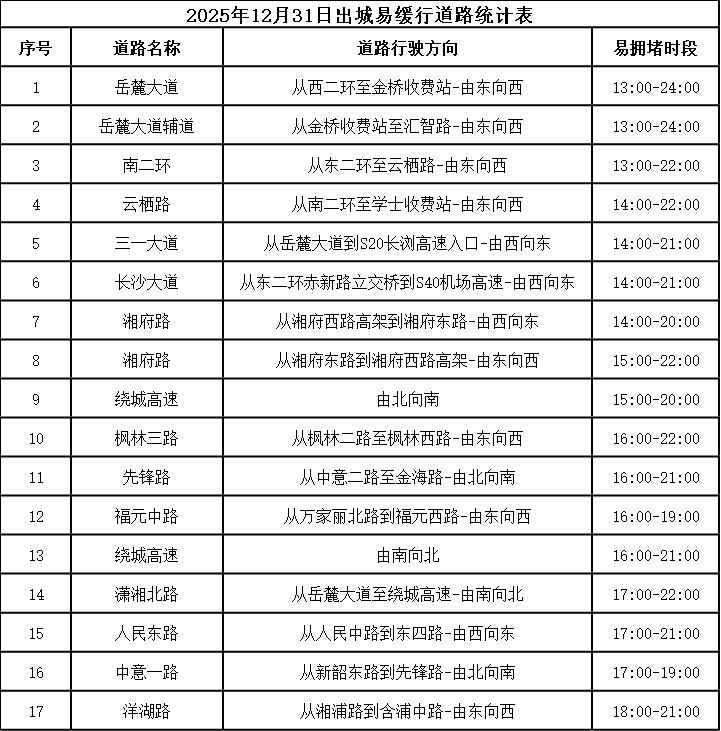 进出城通道方面,出城高峰主要集中在12月31日15时至20时,以及1月1日7时至11时。岳麓大道、云栖路、三一大道、长沙大道、湘府路高架、南二环等道路出城方向车流将显著增加。返程高峰集中在1月3日13时至20时。云栖路、三一大道、湘府路高架、南二环、岳麓大道等道路进城方向压力较大。建议计划通过上述道路进出城的市民,合理安排时间,错开高峰时段。