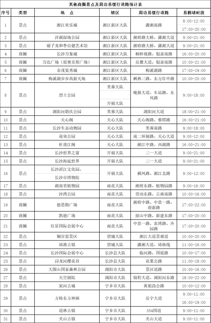 其他易堵点包括德思勤广场、烈士公园、世界之窗、湖南省植物园、梅溪湖步步高新天地、洋湖湿地公园等众多商圈景点周边道路,在每日的特定时段(多为上午、傍晚及夜间)也易出现缓行情况,具体路段及时段可参考交警部门发布的详细列表。