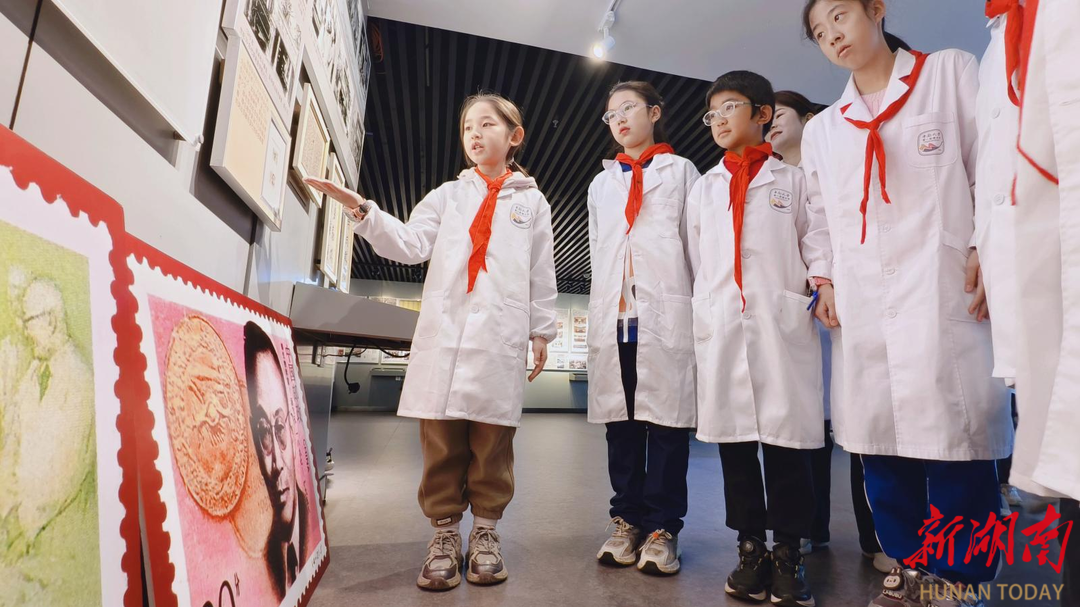 在湘雅二医院院史馆,当同学们从厚重的历史陈列中找到与自己手中相同的邮票时,历史瞬间变得可触可感。这一精心设计的“信物对照”环节,正是课程的核心巧思之一。来自该校“麓枫少年邮局”的李佳霏同学,随即从一位聆听者自然地转变为讲述者。她指向邮票,向同伴们解读背后的故事:“邮票上的张孝骞爷爷,用一生践行‘如临深渊,如履薄冰’的严谨;汤飞凡爷爷则是为了研究病毒,甚至将病原体注入自己眼中……” 这枚小小的邮票,在此刻超越了简单的纪念意义,成为激活自主探究、实现生生互学的关键教具,让“公勇勤慎”的湘雅精神在孩子们自己的讲述中悄然扎根。