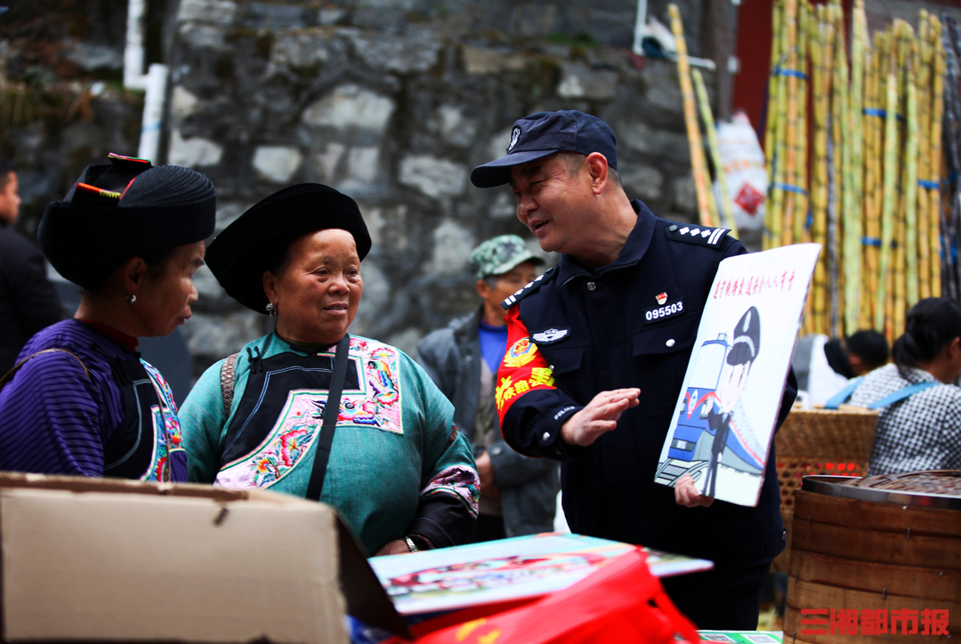 在古丈县默戎镇一处集市,民警对苗族群众进行铁路安全知识和法治宣传。民警提醒苗族群众,不要跨越铁路,不要在铁路上放牧,要珍惜生命,积极维护铁路运输安全。