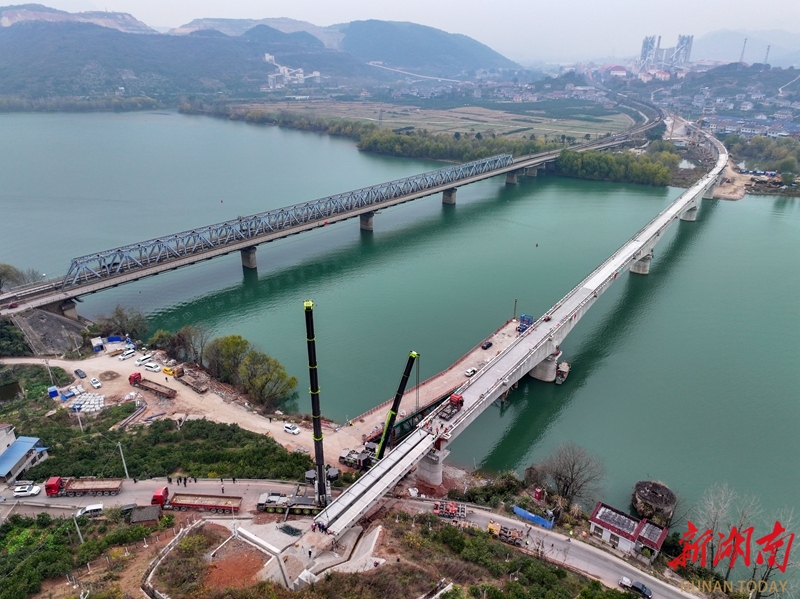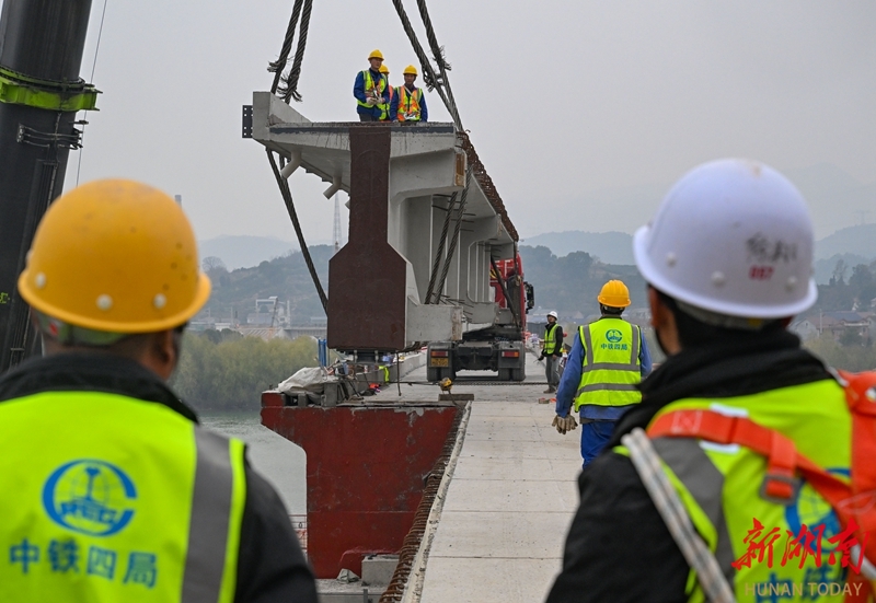 12月29日,石门县,施工人员在进行T梁架设施工。当天,由中铁四局承建的陕煤石门2×66万千瓦扩能升级改造铁路专用线工程施工现场,随着最后一片长32米、重140吨的简支T梁吊装精准入位,澧水特大桥22片简支T梁全部完成架设,标志着扩能升级改造铁路专用线工程全线贯通,为后续铺轨奠定坚实基础。湖南日报全媒体记者 郭立亮 通讯员 李培润 摄影报道