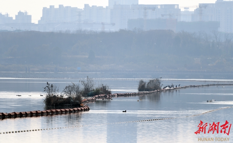 12月29日,湖南松雅湖国家湿地公园,水鸟在生态浮岛边游弋、觅食。近日,该园生态浮岛项目正式竣工。3座浮岛采用模块化组装设计,总面积达48平方米,布设在湖体鸟类活动频繁的浅水区。该项目作为松雅湖水生态保护修复的重要举措,不仅为湿地注入新的生态活力,也实现了水质优化与鸟类栖息环境升级的双重目标。湖南日报全媒体记者田超 摄