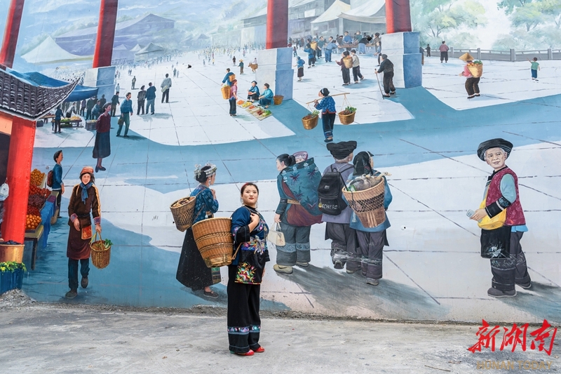 12月29日,吉首市矮寨镇矮寨社区,一幅幅展现苗族赶集的大型墙绘跃然墙上,生动再现了苗乡风情,吸引游客在此拍照打卡。这些精心创作的墙绘作品,既提升了村寨颜值,又让苗族文化以更鲜活的方式走进大众视野。梁永鸿 摄(湖南图片库)
