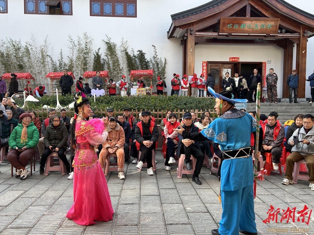 10时许,活动尚未正式启动,食堂外的便民服务专区已提前“热场”。剪发、健康体检、铁锅修补等实用服务台一字排开,写春联摊位前墨香四溢,大学生手工展台吸引不少群众。10点30分,文艺汇演正式上演,豫剧、花鼓戏选段等轮番上演,男女声独唱点燃气氛,为志愿者们送上了专属文化盛宴。