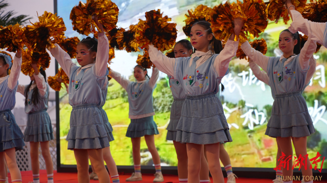 展演环节精彩纷呈,分为“文脉石鼓·育见经典”“沃土石鼓·家校同心”“筑梦石鼓·共启新篇”三个篇章。校合唱社团以《蝴蝶泉边》《卢沟谣》拉开序幕,舞蹈《旗开鼓舞》气势如虹,小朋友们精神抖擞,充满力量感的舞姿引爆全场氛围。诗意在《石鼓春色——诗词中的江山画卷》中流淌,历史的厚重与少年的朝气交相辉映。由家长与孩子联袂演绎的三句半《共聚能 少年强 石鼓旺》金句频出,生动诠释了家校同心的磅礴力量。《弟子规》的朗朗诵读声中,传统美德薪火相传。陶笛合奏《但愿人长久》余音绕梁,歌曲《锦瑟》更是如梦似幻,尽显古典雅韵。啦啦操《小城夏天》瞬间点燃全场,以动感的节拍注入现代的青春活力。