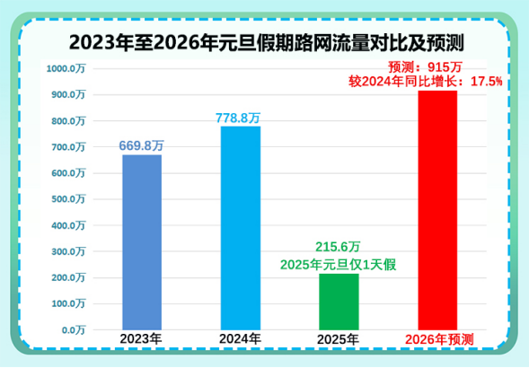 根据路网变化及近年元旦假期路网流量数据走势分析,预测2026年元旦假期全省高速公路出入口总流量为915万辆,日均305万辆,约为平日流量的1.3倍,较2024年元旦假期同比增长17.5%,较2025年元旦假期(1天)同比增长52%。预判峰值日出现在1月1日(假期第一天),峰值流量约为326万辆,约为平日流量的1.4倍。