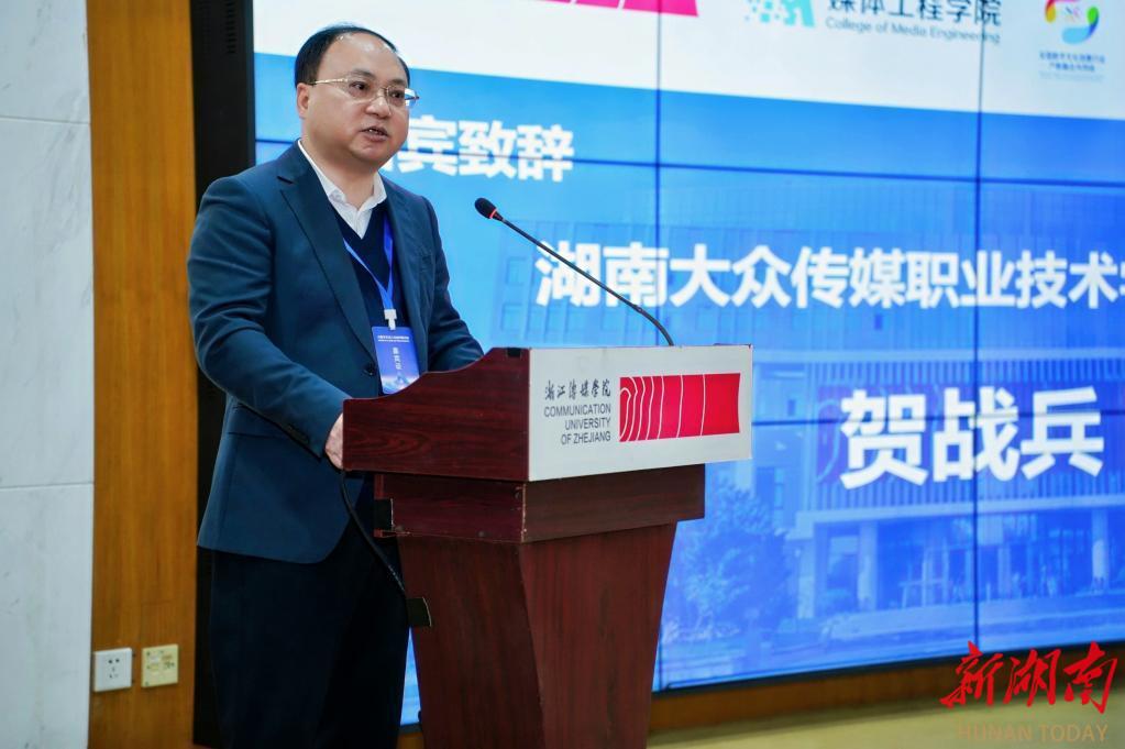 湖南大众传媒职业技术学院党委副书记、校长贺战兵代表共同体牵头单位致辞并表示,职业教育与行业发展紧密相连,在AI与艺术交叉融合的新赛道上,职业院校应主动成为教育支撑产业、创新引领发展的深度参与者和坚定推动者,肩负起培育新型技术技能人才、服务文化强国战略的重要使命。他提出三点倡议:深化“AI+艺术”育人体系,共筑教学创新高地;聚焦科技与文化融合,共推关键技术攻坚;拓展国际职教合作,共育“出海”能力,为数字文创产业高质量发展提供人才保障与智力支撑。