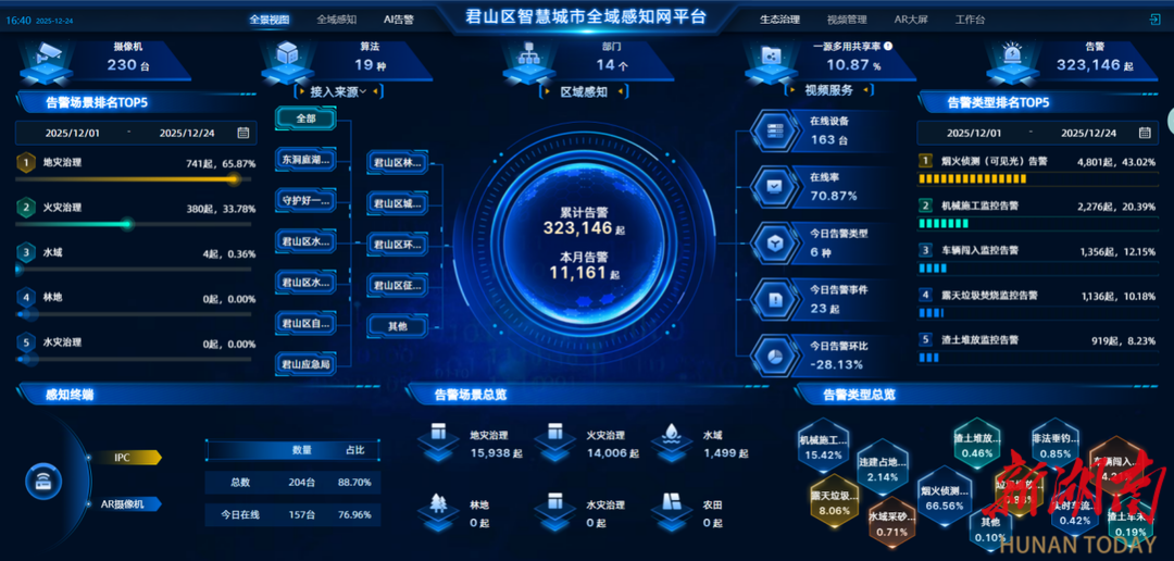 君山区数据局打造的全域视频感知网“智慧大脑”,整合97个高位监控与159个低位监控,形成256路监控资源,实现“高空俯瞰+地面巡查”全覆盖。平台搭载19种AI算法,可精准识别烟火、露天垃圾焚烧等生态隐患,并通过158个区、镇、村三级账号实现指令快速流转。今年以来,平台累计预警20851次,依托“线上智能研判+线下三级值守”协同机制,大幅提升防灾减违响应效率,在筑牢生态安全防线的同时,有效减轻基层负担,推动治理力量精准下沉。