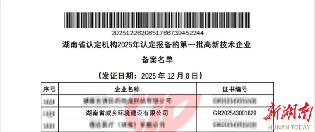 新湖南客户端12月30日讯(通讯员 李翔)12月26日,全国高新技术企业认定管理工作领导小组办公室发布备案公告,湖南建投集团旗下湖南省城乡环境建设有限公司(以下简称“城乡环境公司”)顺利通过2025年湖南省第一批国家高新技术企业认定,标志着该公司在资源与环境领域的研发水平和应用能力获得国家权威认可,为企业市场拓展与提质增效注入强劲动力。