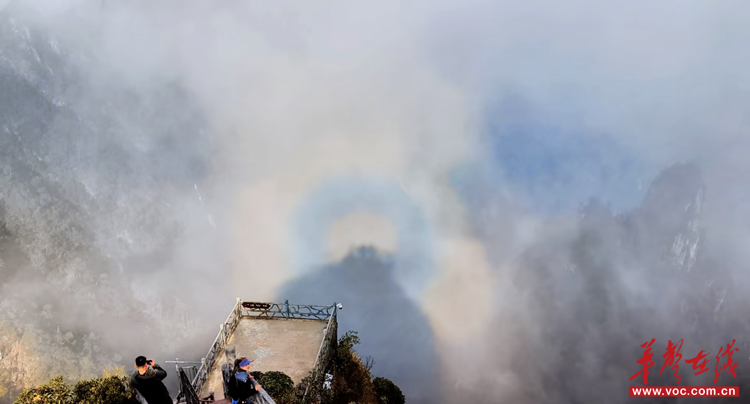 “登郴州五指峰,云海漫过指尖,忽见‘佛光’破晓。举镜定格时,竟见自己的身影落于光环正中——原来追光的人,终会与光同频。”网络达人、摄影师段彪在五指峰幸运邂逅罕见的雾中“佛光”,当即在朋友圈记录下这一奇妙瞬间,引发广泛共鸣。