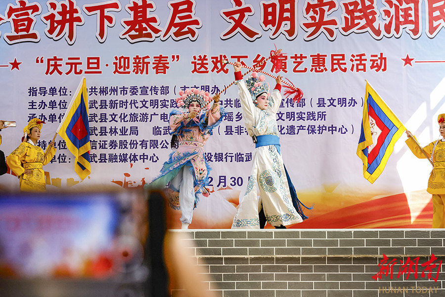12月30日,临武县西山瑶族乡寺湾村,县文化志愿者在表演临武特色祁剧《穆桂英招亲》。当天,该县新时代文明实践中心开展“理论宣讲下基层 文明实践润民心”主题活动,志愿者通过祁剧表演、摄影展等形式,生动传播党的创新理论,让惠民政策走进乡村。 陈卫平 摄(湖南图片库)