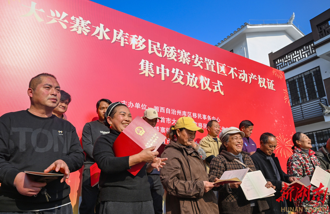 12月18日,移民安置户开心地领取到属于自己的“红本本”。当天,吉首市举行大兴寨水库矮寨移民安置区不动产权证书集中发放仪式,55户安置户开心地领到象征产权保障的“红本本”,实现了从“住有所居”到“住有所权”的关键一步。 湖南日报全媒体记者 郭立亮 摄