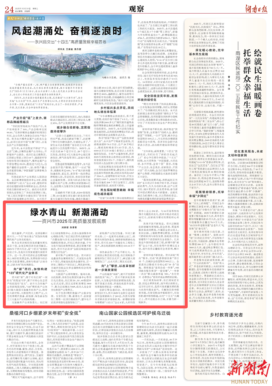 作为全省县域经济高质量发展先进县十强、全省县域经济突出贡献县,2025年于资兴而言,是“十四五”规划的收官之年,也是灾后恢复重建巩固提升之年。这一年,资兴经济社会呈现向新向上向好的发展态势,发展能级与综合竞争力显著增强,清晰勾勒出“以绿为底、以新为核”的发展路径。