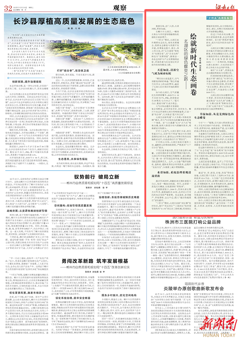 “十四五”期间,北湖区始终秉持生态优先、绿色发展理念,坚持生态修复与资源开发并重,统筹推进蓝天、碧水、净土保卫战,把“山水画卷”转化为“发展答卷”,把“历史包袱”转变为“发展财富”,探索出一条生态保护与产业发展相得益彰、环境改善与民生福祉同步提升的绿色蝶变之路。