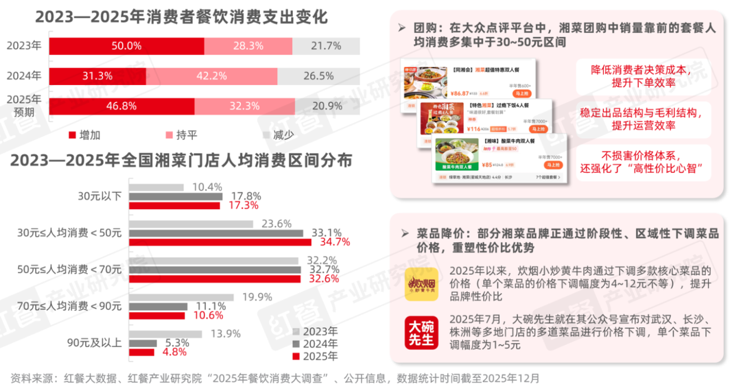 近年来,消费者的餐饮消费较为审慎。据红餐产业研究院调研,2024年餐饮消费支出增加的消费者占比较2023年大幅下降,对于2025年的餐饮支出预期,超过半数的消费者表示其2025年餐饮消费支出将有所下降或保持不变。在性价比需求持续增长的大背景下,团购、菜品降价等方式逐步成为部分湘菜品牌稳定客流、提升吸引力的重要手段。这一变化也在湘菜门店的人均消费分布上有所体现。具体来看,湘菜门店的人均消费分布结构在2024年发生较大变化后(人均消费在50元以下的门店数占比大幅上升),2025年整体趋于稳定,基本延续上一年的人均消费分布结构。但30~50元区间的门店数占比较2024年有所上升,湘菜门店的人均消费更加集中于中低价位。