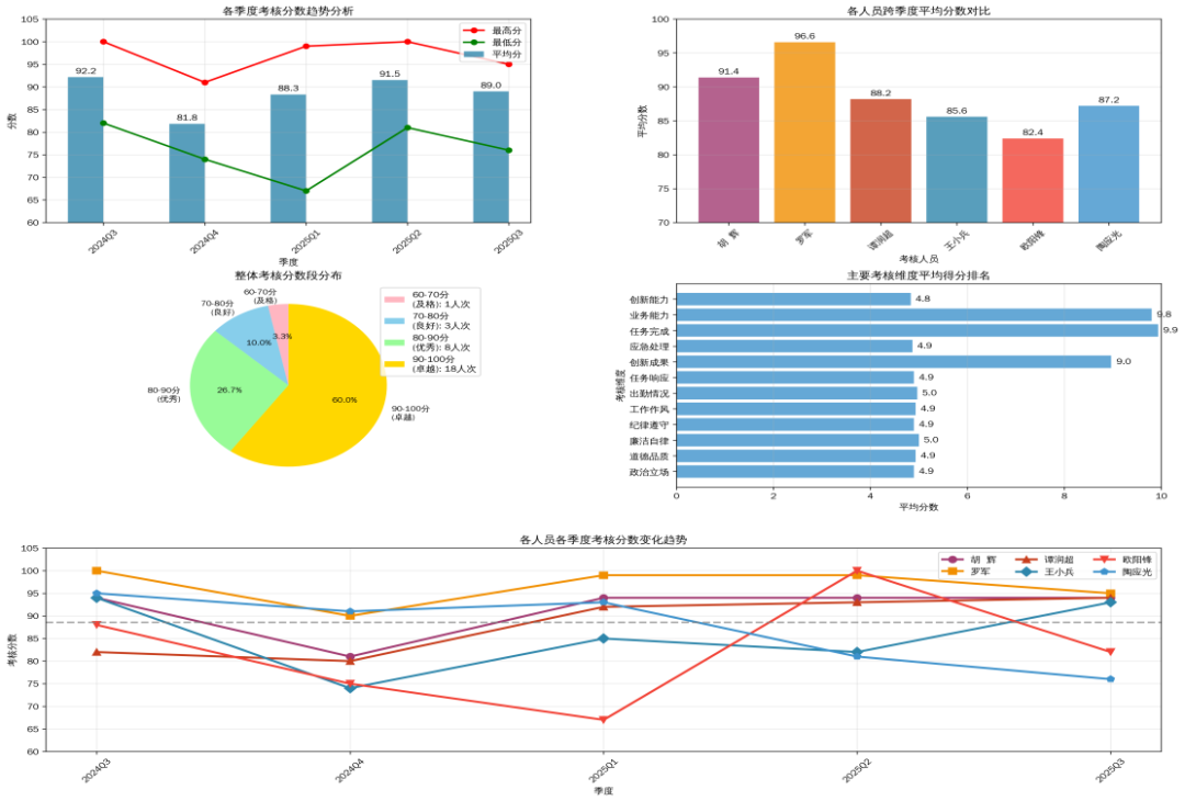 ▲成长激励。将考核结果与干部三年成长规划相衔接,累计积分作为职务职级晋升重要依据。建立“创新突破”“攻坚克难”“服务标兵”三大荣誉榜单,上榜人员优先获得培训研学机会。设立“青年领军人才培养计划”,对连续3个季度考核优秀干部实施定制化培养。自量化考核实施以来,重点工作完成率提升28.6%,创新提案数量增长175%,服务满意度达到98.7%;信访投诉下降33%,超期办件减少82%,庸懒散现象基本清零。