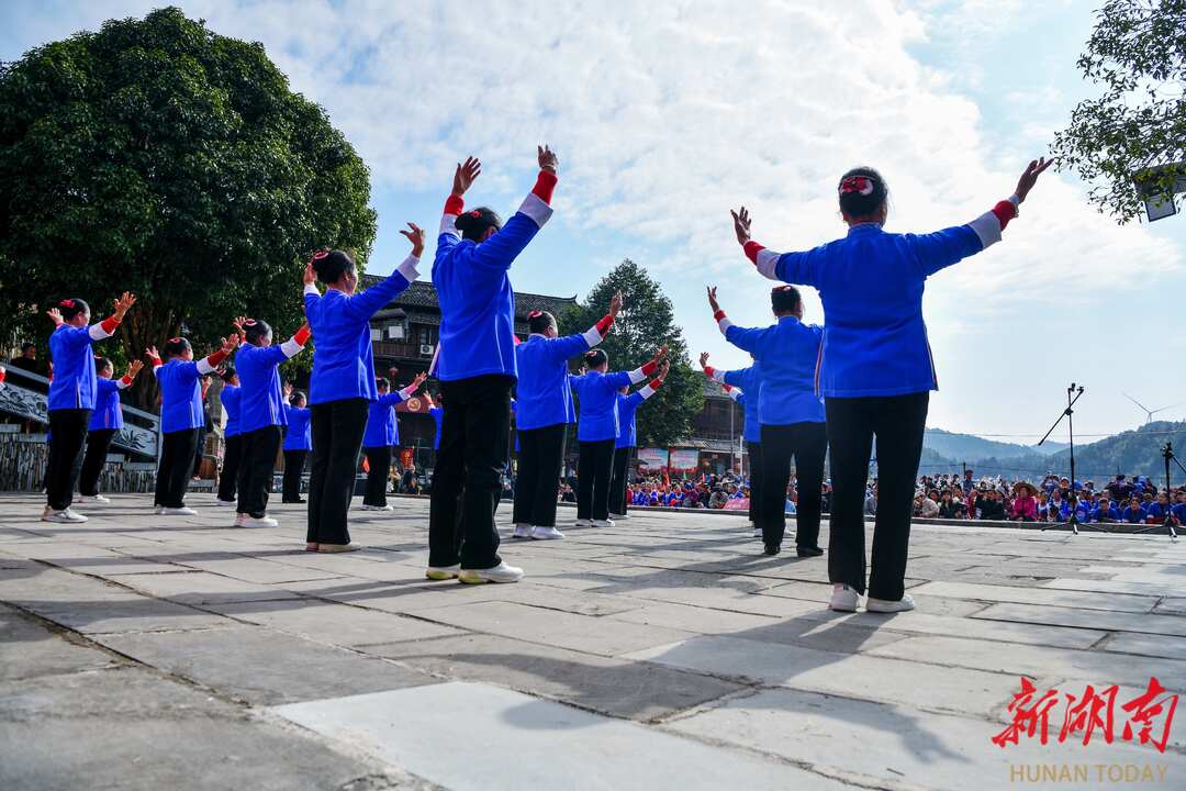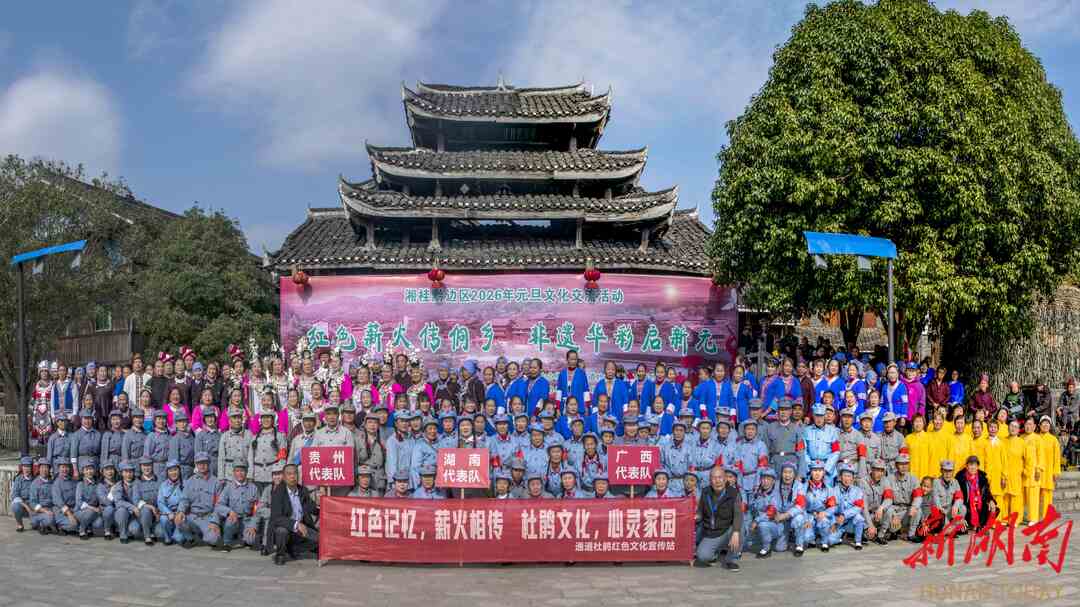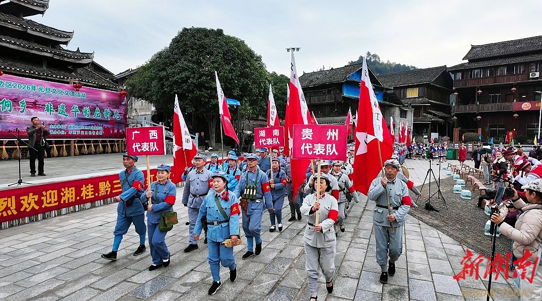 新春脚步渐近,侗乡暖意正浓。12月28日,通道侗族自治县坪坦乡坪坦村洋溢着节日的喜庆氛围。一场以“红色薪火传侗乡 非遗华彩启新程”为主题的湘桂黔边区2026年元旦文艺汇演在这里举行,三省边区的各族群众跨越山水,齐聚红色热土与文化福地,共迎新年。(王启友)