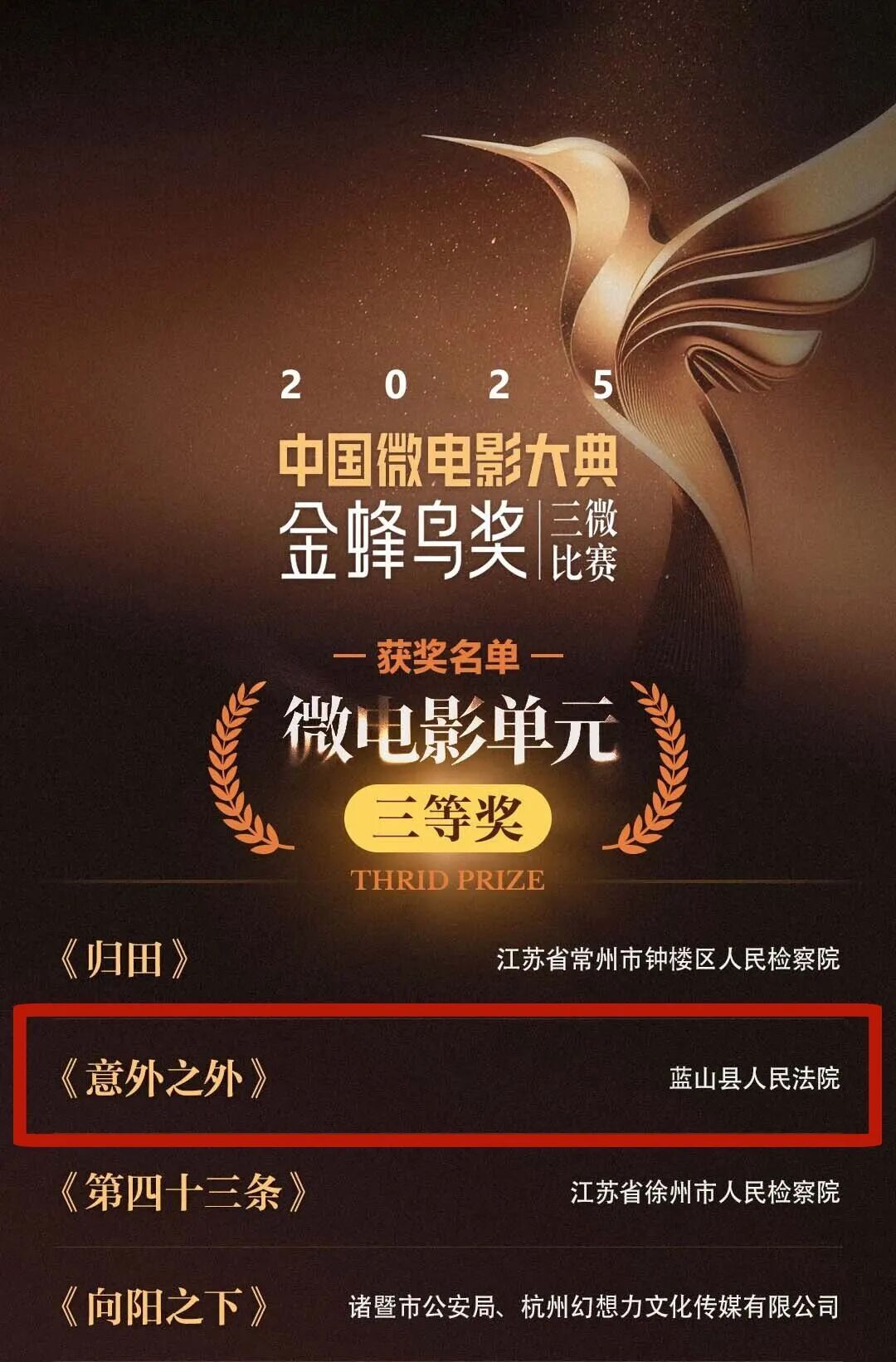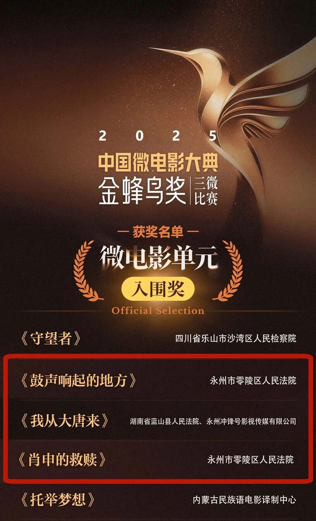 2025·中国微电影大典“金蜂鸟奖”三微比赛历经层层筛选与评委会的严谨评审,获奖表彰名单正式出炉。作为国内首个由中宣部、国家广电总局等16个部级单位联合指导的国家级微电影权威赛事,“金蜂鸟奖”三微比赛被誉为中国微电影领域的“奥斯卡”。永州法院系统6部作品脱颖而出,荣获奖项,快来看看有哪些吧!