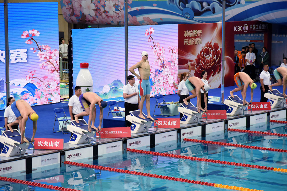 ↑3月19日,孙杨(上)在2025年全国春季游泳锦标赛男子400米自由泳决赛中等待出发。