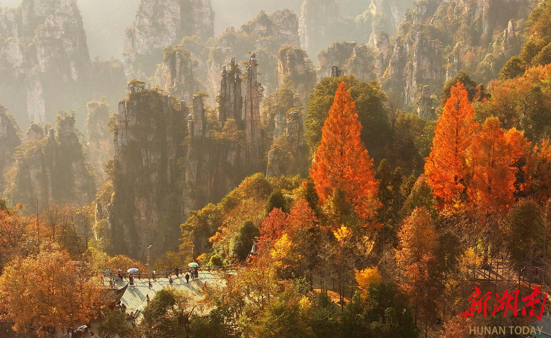 2025年11月15日,张家界国家森林公园天子山,连绵峰林在五彩树木的装点下,更显诗情画意,美不胜收。湖南日报全媒体记者 郭立亮 通讯员 吴勇兵 摄