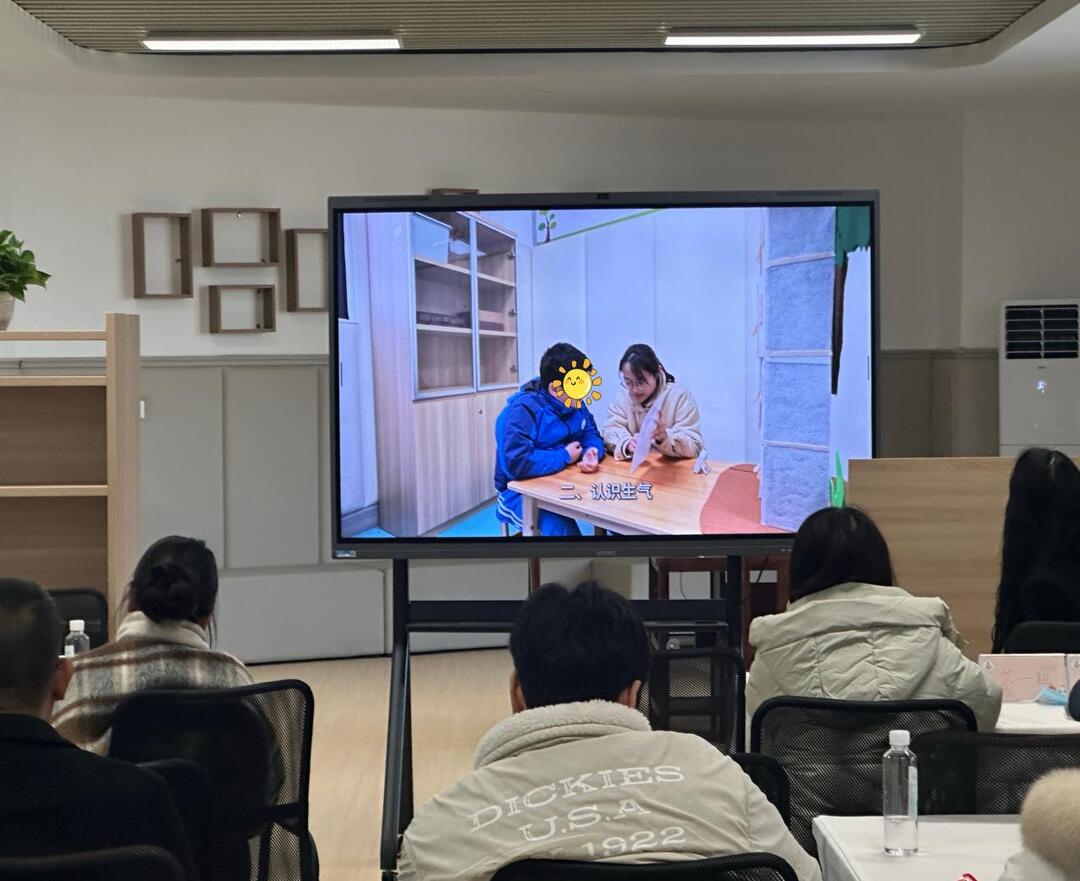 课例观摩环节,历欣茹、陈韦君两位老师的集体课与个训课,以视频课的形式清晰呈现了行为干预与情绪管理策略。历欣茹主教生活数学课《按颜色分类》,将学科知识与情绪管理融合;陈韦君辅教时针对情绪行为问题学生实施前事预防、后效处理策略,二人协同打造了一堂形式创新、实效显著的生活数学课堂。陈韦君执教的个训课《识别与表达情绪——生气》,依托校本教具《心情妙妙屋》,运用情境模拟、多感官教学等方法,将科学干预理念融入教学细节,为特需学生的情绪成长搭建了坚实支架。