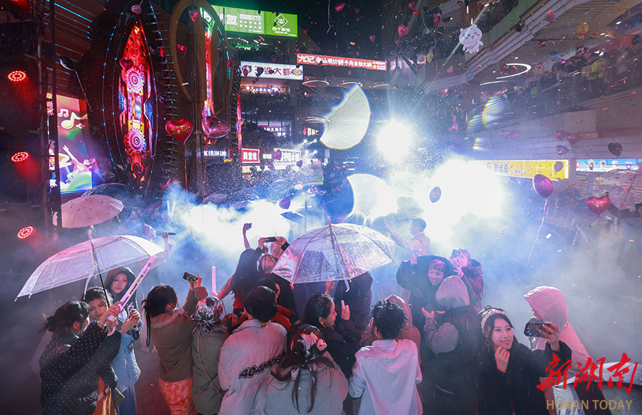 2025年12月31日晚,邵阳大汉·悦中心跨年音乐节火爆上演。音乐节由湖南广电与商业地标联合打造,武汉绿豆赢乐队等实力演出团体带来精彩表演,《新年快乐》全场大合唱将气氛推向高潮。此次活动创新融合音乐演出与互动游戏,“芒果同款游戏”区吸引众多家庭参与,“听歌识曲”挑战赛引发全龄段共鸣。作为邵阳首批省级夜间消费示范区,大汉·悦中心已连续七年举办跨年活动。 涂涂 摄(湖南图片库)
