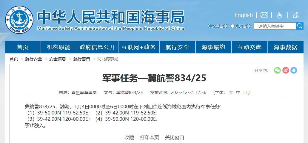据中国海事局网站消息,秦皇岛海事局发布航行警告,1月4日0时至6日0时,渤海部分海域执行军事任务,禁止驶入。