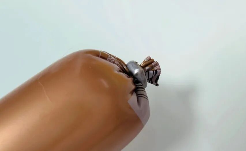 所以,火腿肠的封口就不能靠肠衣薄膜自封来实现,需要借助工具。如果用绳子直接扎口,在高温加工过程中随着肠体的膨胀和收缩很容易松动,会增加细菌进入的机会。“结扎端残留肉糜”或“封口密封不严”都是导致火腿肠胀气的常见原因,[5]想要火腿肠不变质,封口必须要严实。