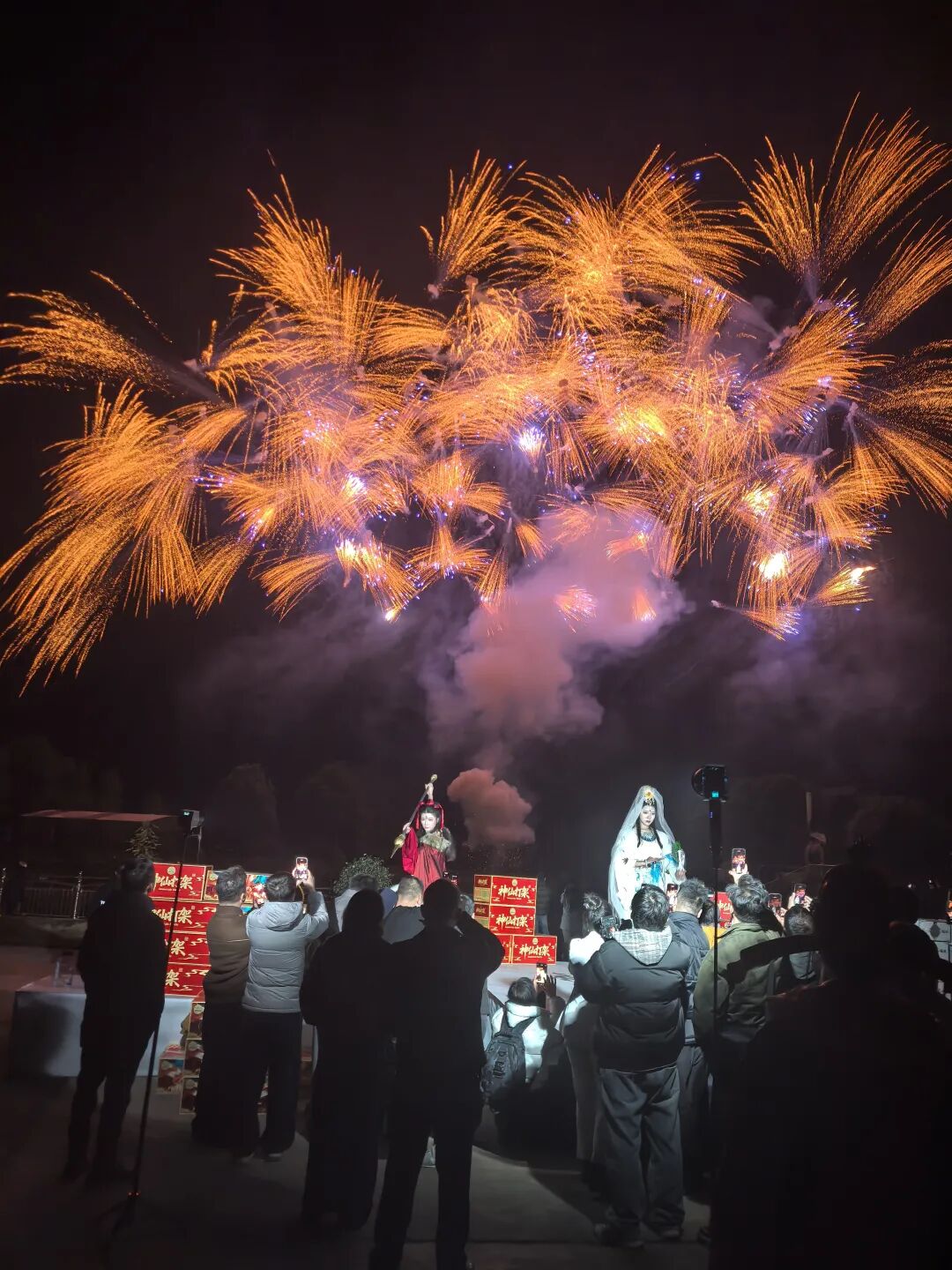 最后登场的,则是“观音战队”,采用柔和的淡紫、暖白烟花,打造“杨柳洒露”“莲座生光”的静谧效果,烟火缓缓飘落时,宛如祥瑞降临,温柔又治愈。