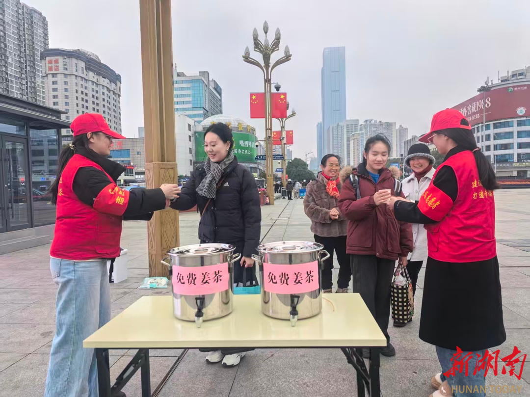 1月1日上午,寒风凛冽,火车站广场上却洋溢着温暖的节日氛围。“红火炬”雷锋志愿者们身着红马甲,穿梭在客流中,为旅客送上一杯杯暖心姜茶、帮旅客拍照、引导旅客写下新年心愿……他们用细致的服务传递着“长沙温度”。