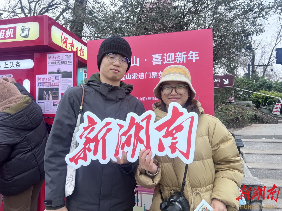 “没想到我也能上头条!”1月2日,在岳麓山顶,来自湖北的大学生陈欣举着刚打印出的照片兴奋地说,“还能抽红包、讨彩头,这个新年祝福太旺气了!”