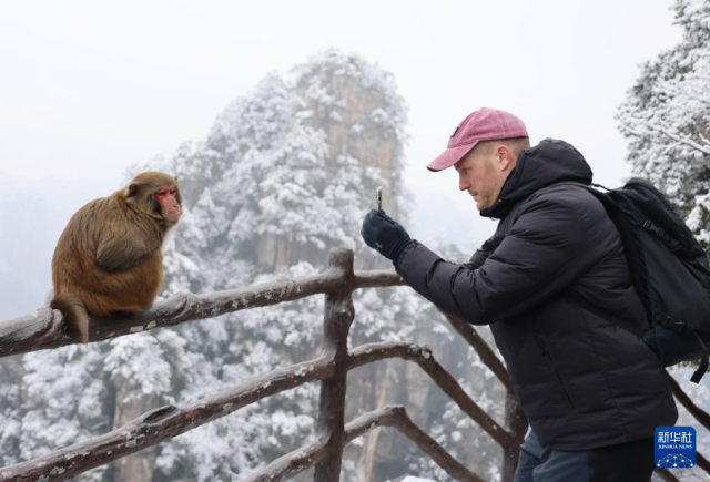 1月2日,一名外国游客在湖南省张家界国家森林公园黄石寨景区拍摄猕猴。