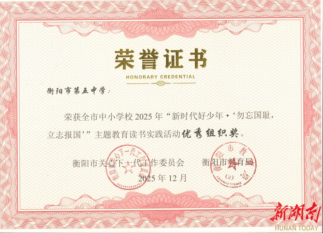 衡阳市五中荣获全市中小学校 2025年“新时代好少年·'勿忘国耻:立志报国’”主题教育读书实践活动优秀组织奖