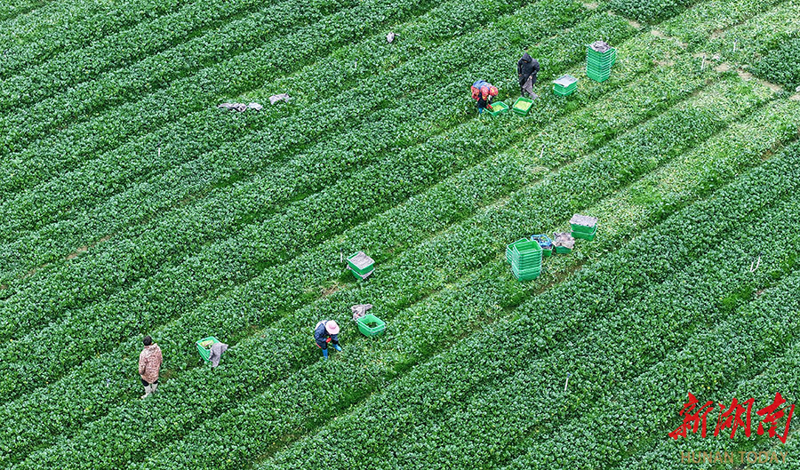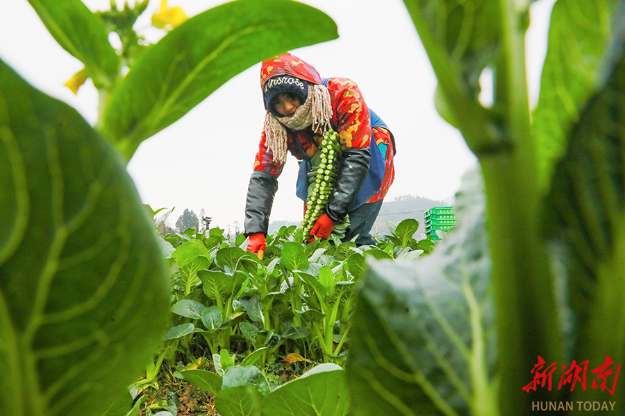 1月3日,新田县中山街道东升村,村民在田间采收菜心。元旦假期,该县东升农场蔬菜基地根据节日市场需求,及时组织采收,保障蔬菜稳定供应。 刘贵雄 陈祉凝 摄影报道(湖南图片库)