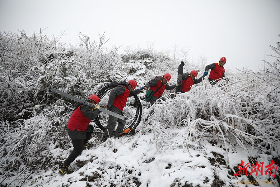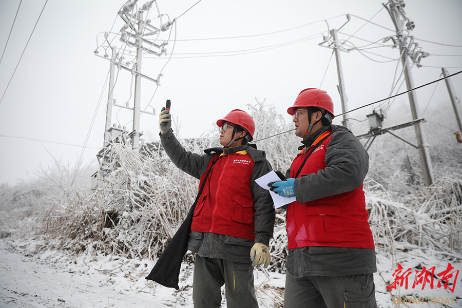 1月3日,龙山县洛塔乡阿亏村海拔1200多米的高山地区,国网龙山县供电公司员工对供电线路开展特巡。针对电网覆冰蓝色(IV级)预警,元旦期间该公司组织共产党员服务队奔赴6个高海拔流动冰情监视哨,开展观冰特巡,执行“一日三报”制度,全力保障冰雪天气下电网安全稳定运行。 田良东 摄(湖南图片库)