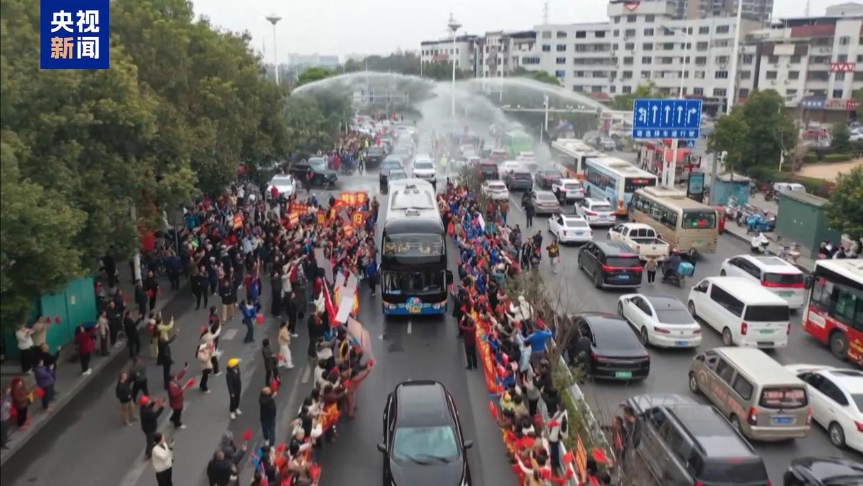 狂欢的热浪,持续涌向永州的每一个角落。本周一,冠军开始前往周边区县巡游。从零陵古城到宁远、新田,每一站都热血沸腾。当永州队车队缓缓驶来,两辆消防车同步开启“过水门”仪式。虽然是工作日,但球迷们都请了假,有的家长还带着孩子专程奔赴这场狂欢。