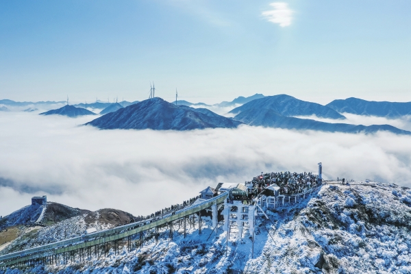 1月3日,蓝山县云冰山景区,壮丽的云海与晶莹雾凇交织,游客徜徉其间,仿佛置身于冰清玉洁的冬日仙境。