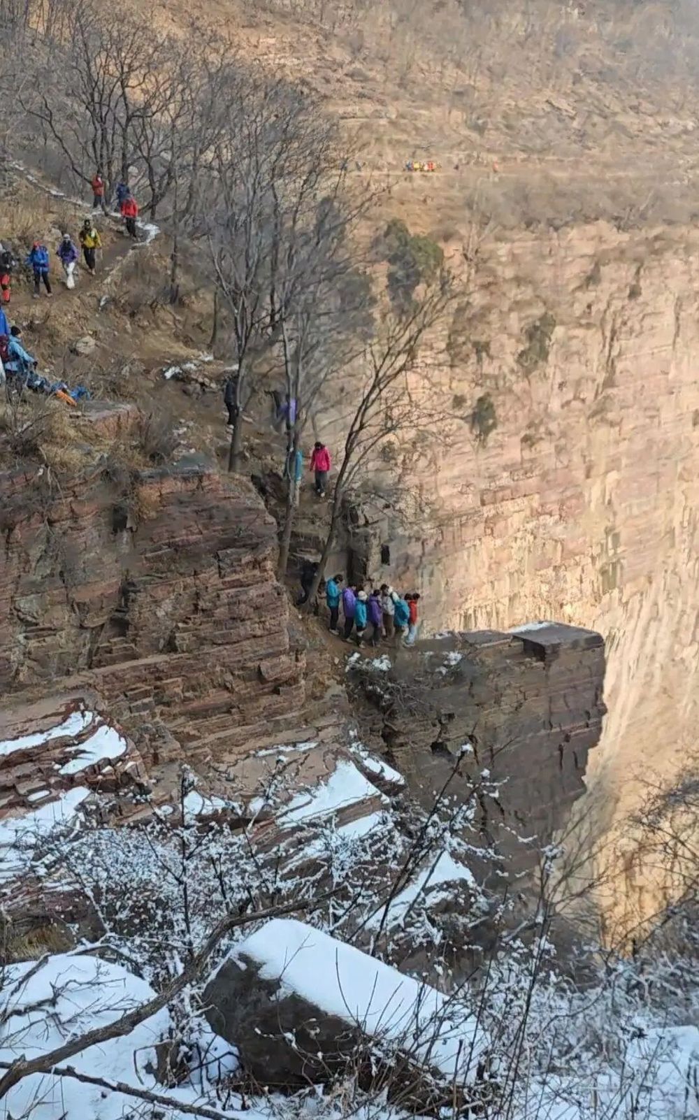 一名徒步者目睹了该男子坠崖的全过程,他告诉极目新闻记者,当时现场一片混乱,许多人高喊有人坠崖了并报了警。因近日南太行山区出现降雪,路面很滑,并且徒步登山的人也很多,通行难度极大,该男子可能是滑倒摔落崖底不幸遇难的。