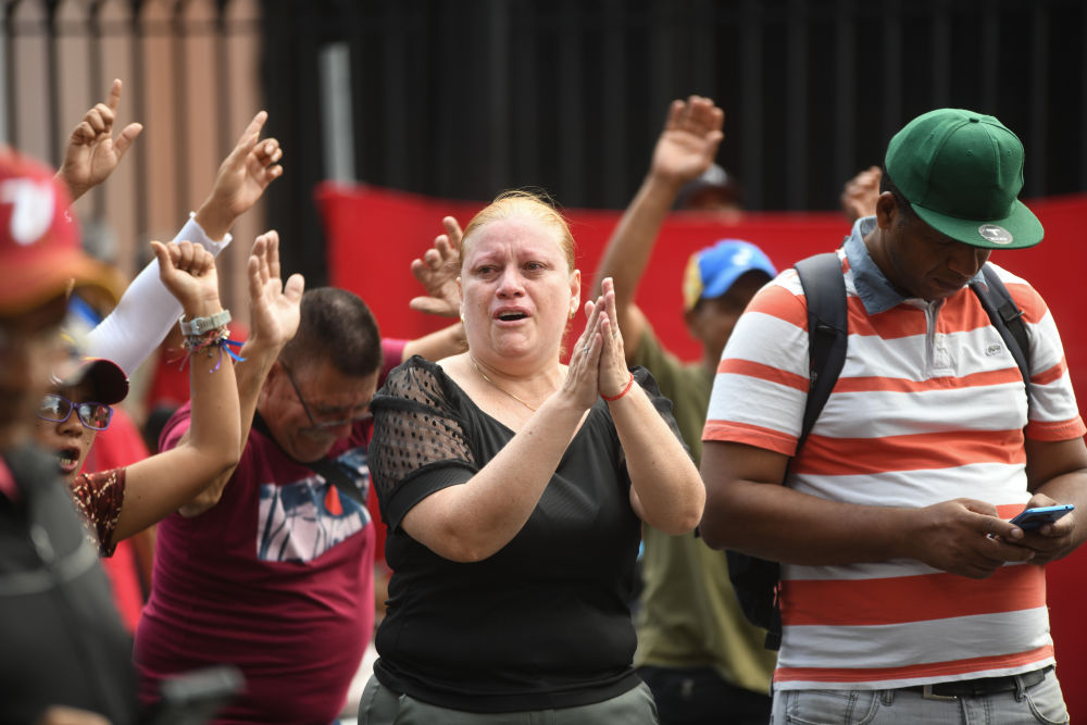 ↑1月3日,在委内瑞拉首都加拉加斯,人们在米拉弗洛雷斯宫附近集会。