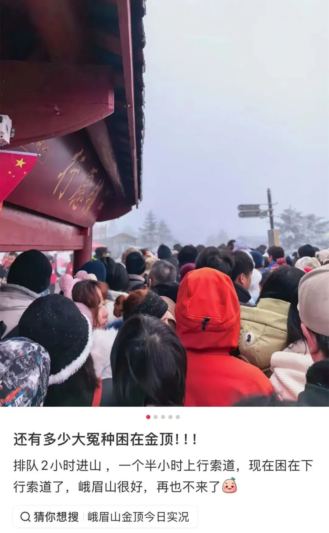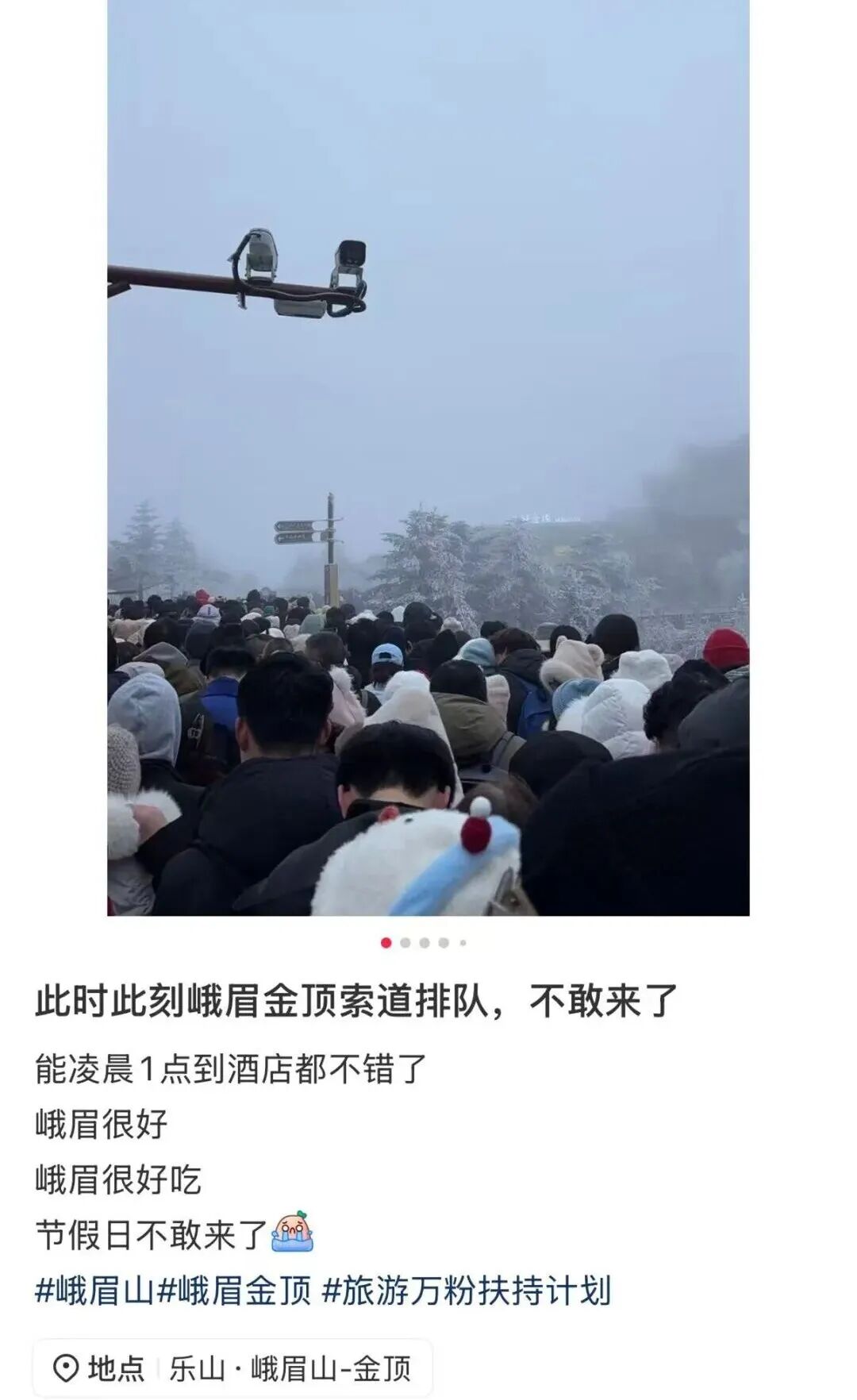 一位女游客发帖称,2日9时许,她到黄湾游客中心,坐上观光车用了很长时间才到雷洞坪,路上堵到想哭。随后,她步行去坐索道,没想到步行也堵,正常20分钟路程硬是走了1个小时。“一路上都是人挤人,下山和上山都在一条道上,上面的下不来,下面的等着上去,互不相让。”该游客说,好不容易到达索道入口,排队近一个小时,才上去金顶。金顶的雾凇很美,但不敢多逗留,打了个卡就赶紧去排队乘下山的索道。