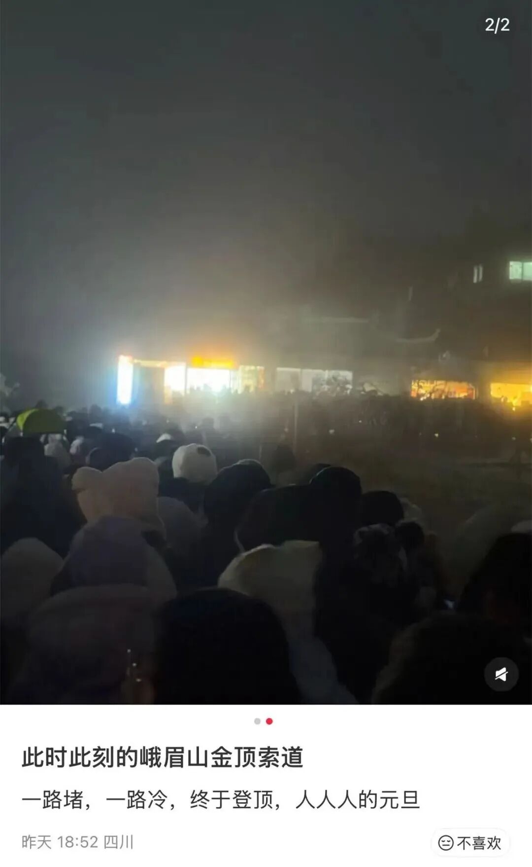 1月2日晚,有游客发视频称,四川峨眉山景区因游客较多,导致下山难,有游客排队近3小时才成功下山。还有不少游客被困山上,挤进山顶的酒店大堂过夜。