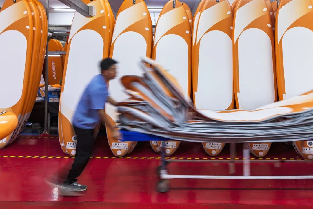 2025年9月19日,江苏宿迁:吉龙运动休闲公司内,忙碌的工人。