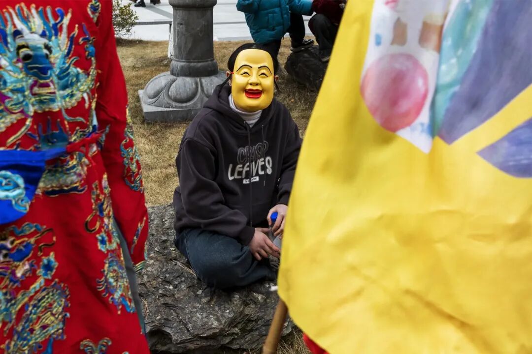 2025年1月18日,江西上栗:戴着傩面具的青年。