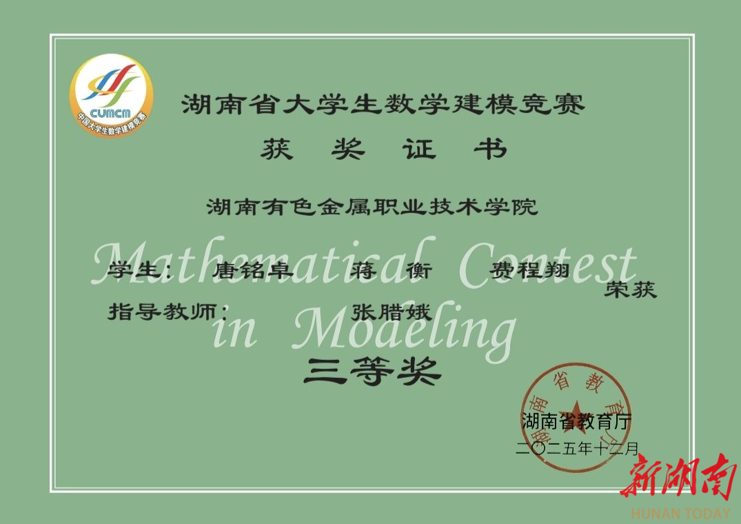 湖南日报·新湖南客户端1月5日讯(通讯员 晏诗洁 邱智海)近日,2025年第32届湖南省大学生数学建模竞赛暨全国大学生数学建模竞赛湖南赛区获奖名单正式公布。湖南有色金属职业技术学院派出两支队伍参赛,在与全省70余所高校、1823支参赛队伍的激烈比拼中表现优异,分获高职高专组一等奖和三等奖,展现了学院学子突出的综合素养与创新实力。其中,由谭卓炎、肖赛翔、余湘组成的团队荣获一等奖;唐铭卓、蒋衡、费程翔组成的团队获得三等奖。