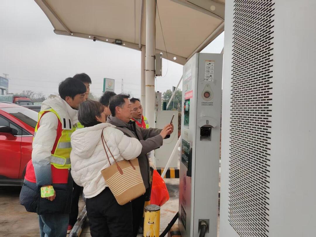 服务区内,技术组运用专业设备为车辆进行安全检测,当发现车辆胎压整体偏低时,及时提醒车主补充胎压,避免安全隐患。面对不熟悉操作的新能源车老年车主,志愿者们耐心指导充电步骤,并细致讲解新能源车辆的日常保养知识。同时,师生们还向司乘人员发放调查问卷与自编的交通安全知识手册,在提供专业服务的同时开展安全教育。